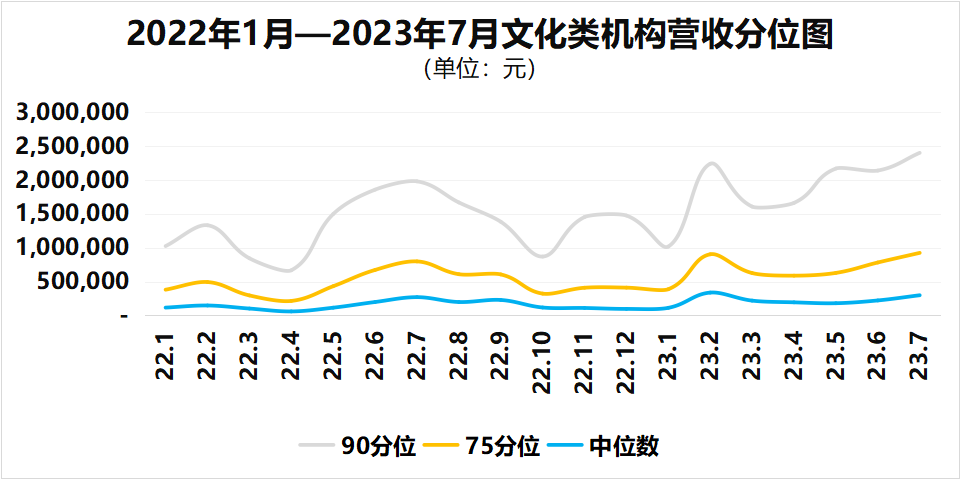 90分位、75分位、中位数:将样本内的数值按降序(从大到小)排列后,排在前10%、25%及50%的数值。比如90分位的营收是60万,而某机构的营收是63万,那么说明该机构的营收排名已进入前10%,即:打败了90%以上的机构。