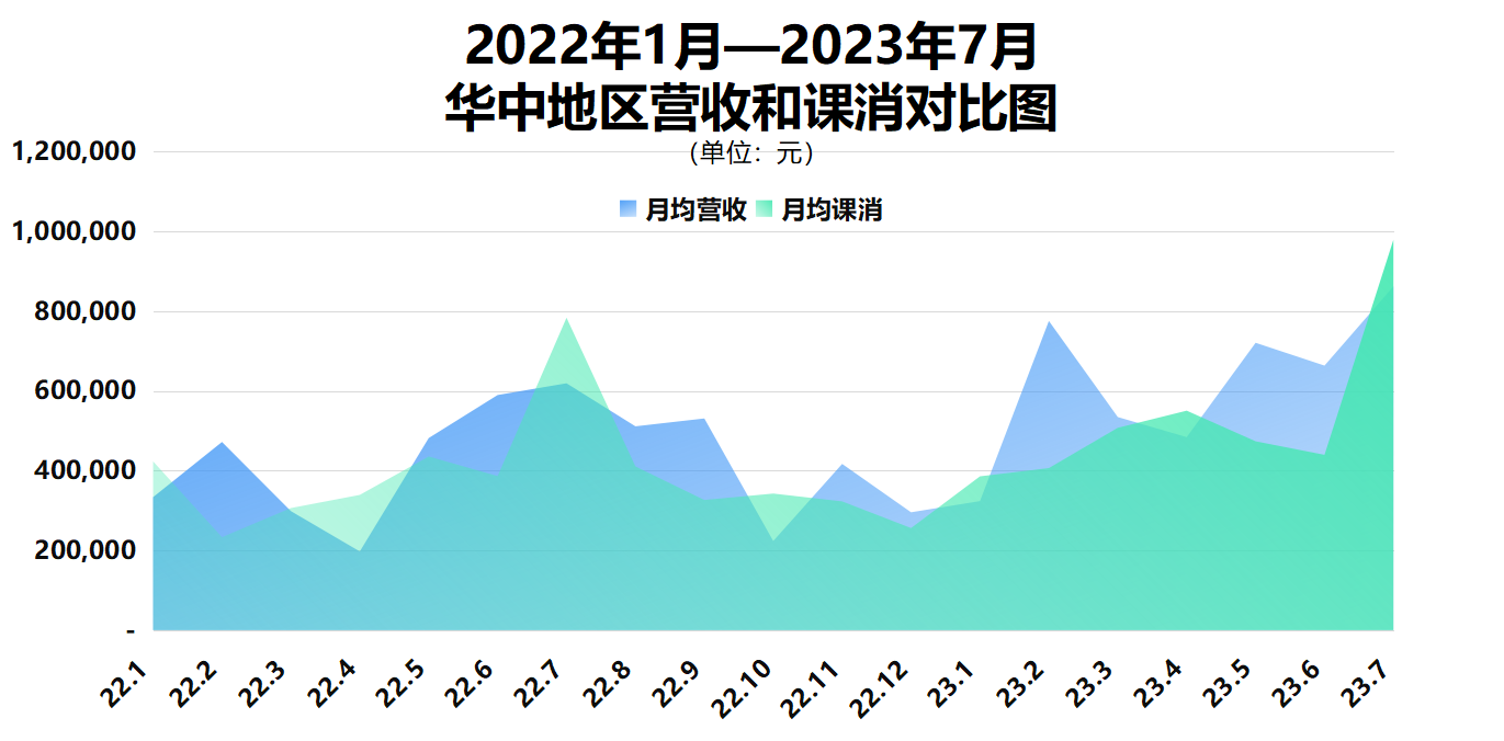 营收和课消面积图:体现营收和课消两者之间的趋势和面积比例差距,一般而言,健康的状况,营收和课消的趋势基本重合,或者处于交替的状态,也就是营收高峰后,紧接着是课消高峰。而且两者的面积比例差距不宜过大,若课消大于营收,则可能出现现金流不足,若营收大于课消,则可能出现退费风险。