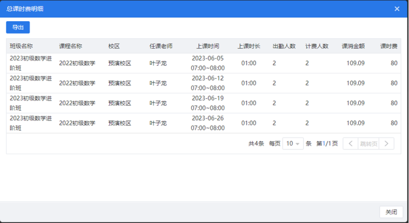 计算示例:王老师1月份共上了2节课,一节课课消总金额是500元,一节课课消总金额是600元;