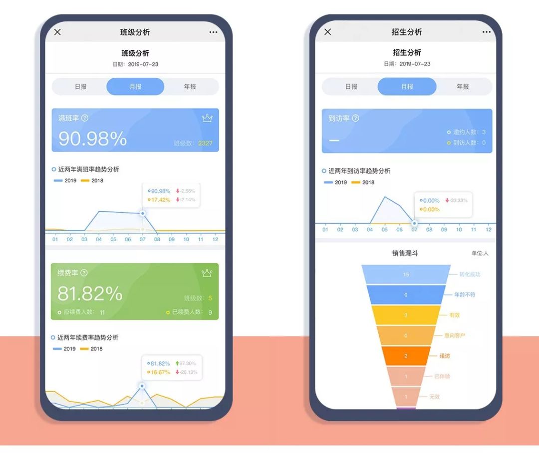 同时,运营日报也汇总了校区的月报和年报,支持各项数据的环比、同比分析,为管理层做月度计划或者经营政策调整提供及时有力的数据支撑。
